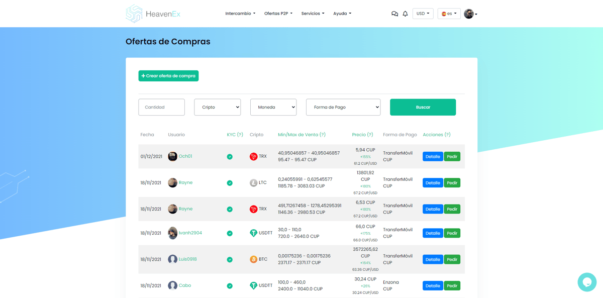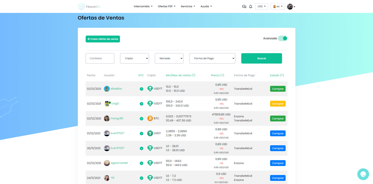La sección Ventas entre personas (P2P) es, precisamente, la más conocida en HeavenEx. En ella, los usuarios publican sus ofertas de criptomonedas y esperan a que los compradores les realicen pedidos. La plataforma cuenta con una leyenda de colores: azul para las ofertas que aceptan pedidos automáticamente, verde para aquellas con criptomonedas disponibles para vender que requieren de aceptación manual, amarillo para las ofertas que aceptaron un pedido y cuentan con más cripto para comercializar y rojo para las ofertas que aceptaron un pedido que agotará todas sus criptomonedas si la transacción se realiza.