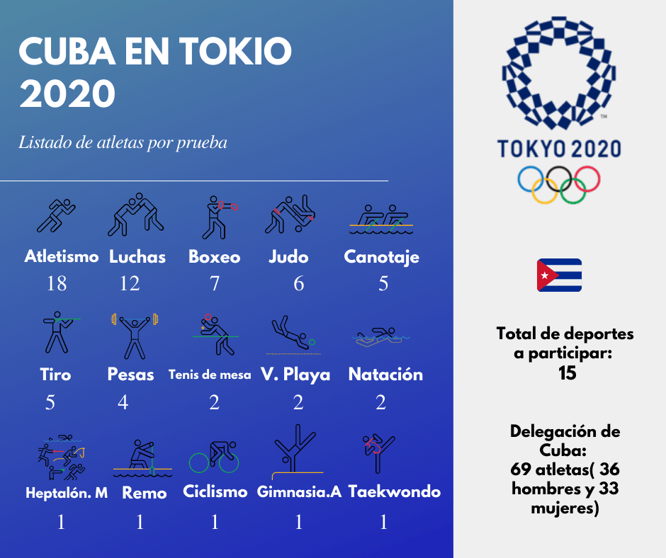 En los próximos Juegos de la XXXII Olimpiada, que tendrán lugar desde el 23 de julio hasta el 8 de agosto en Tokio, Japón, Cuba participará en 15 deportes con un monto de 69 atletas; de ellos 36 hombres y 33 mujeres. Esta es la cifra más baja desde Tokio 1964, donde el país participó con solo 27 deportistas.