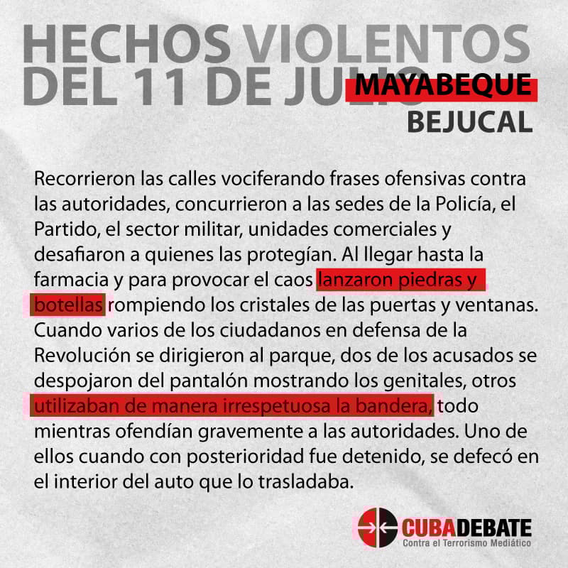En la nota de prensa publicada el 3 de febrero de 2022 sobre los procesos penales a acusados por los hechos del 11 y 12 de julio, se dio a conocer que en Bejucal, municipio de Mayabeque, estos protagonizaron el ataque a una farmacia.