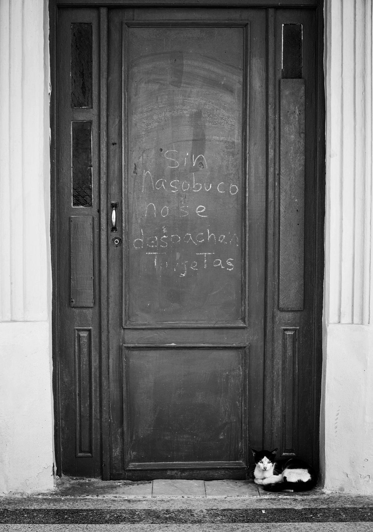 Esta foto la tomé en La Habana Vieja. Quise mostrar un gato en un rol que generalmente se atribuye a los perros, cuidar la casa. El aviso representa estos tiempos de pandemia (Foto: Randy B.).