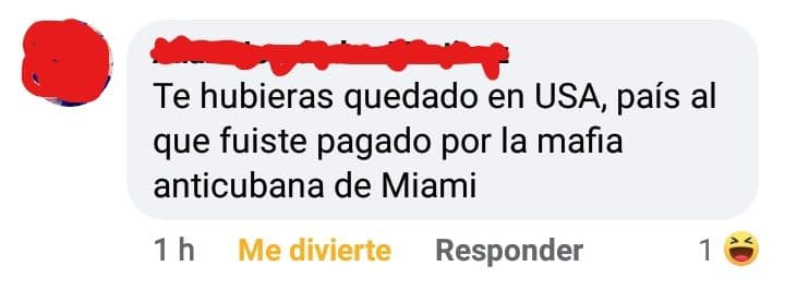 Me lo dejó en Facebook un perfil falso. Me entristece, aunque le di «me divierte». Mi madre le respondió que yo había vuelto por amor a la patria, a mi familia, una muela de esas. Yo no pierdo tiempo en responder nada porque no sé bien ni por qué lo hice. Sobre quién me paga…