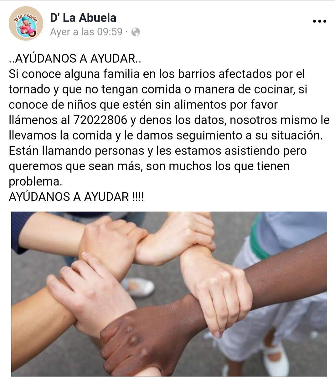 “Solo pedimos que esté empaquetado y con la descripción de la ayuda para facilitar su rápida entrega. El sábado en la mañana estaremos compartiendo con los vecinos de 10 de octubre”.