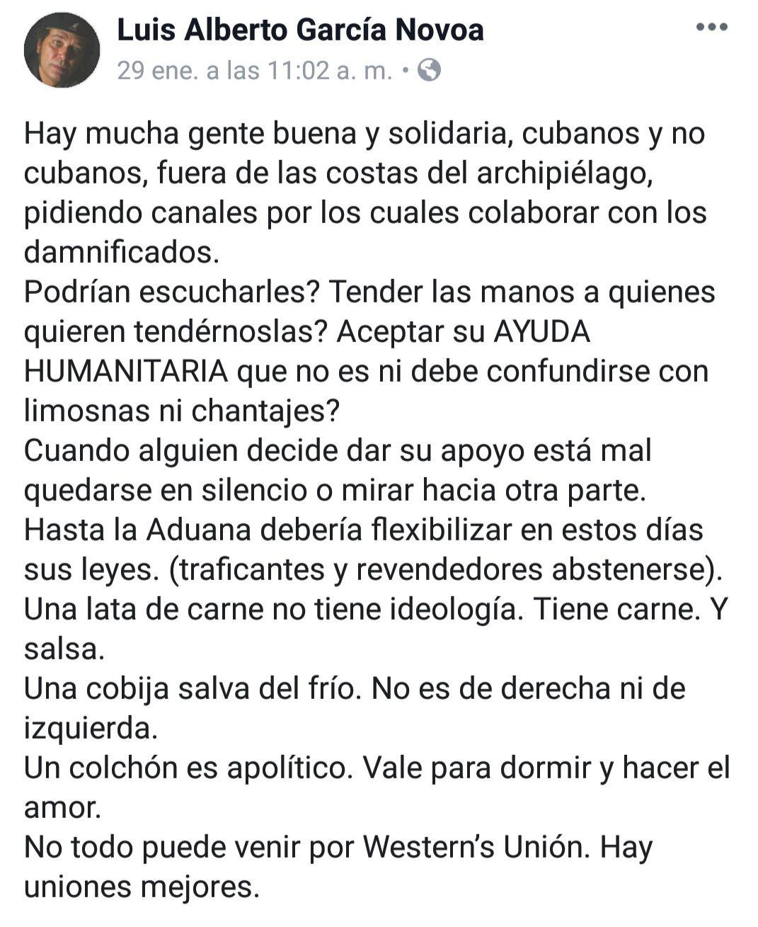 Veremos si los coordinadores de iniciativas, tanto en la Isla como en el extranjero, acatan esta decisión del gobierno, o hallan otras vías para hacer llegar de manera directa su ayuda.