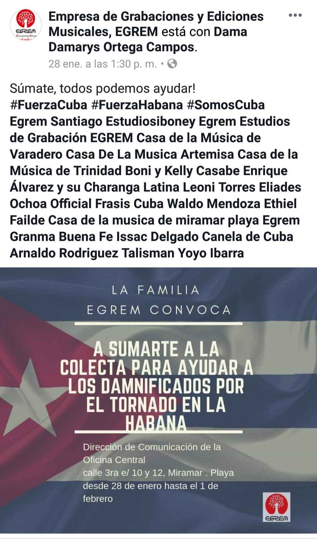 Por su parte, la Empresa de Grabaciones Musicales (EGREM) hizo un llamado a los músicos de su catálogo a unirse a una colecta para entregar a los damnificados.