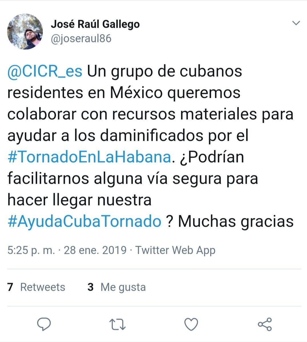 Desde México, varios cubanos que estudian o trabajan allí, se han movilizado en Twitter con la etiqueta #AyudaCubaTornado para pedir al Comité Internacional de la Cruz Roja su colaboración en el envío de ayuda a Cuba. Aunque a la petición se han sumado también mexicanos, hasta el cierre de esta nota no tenían respuesta del CICR.