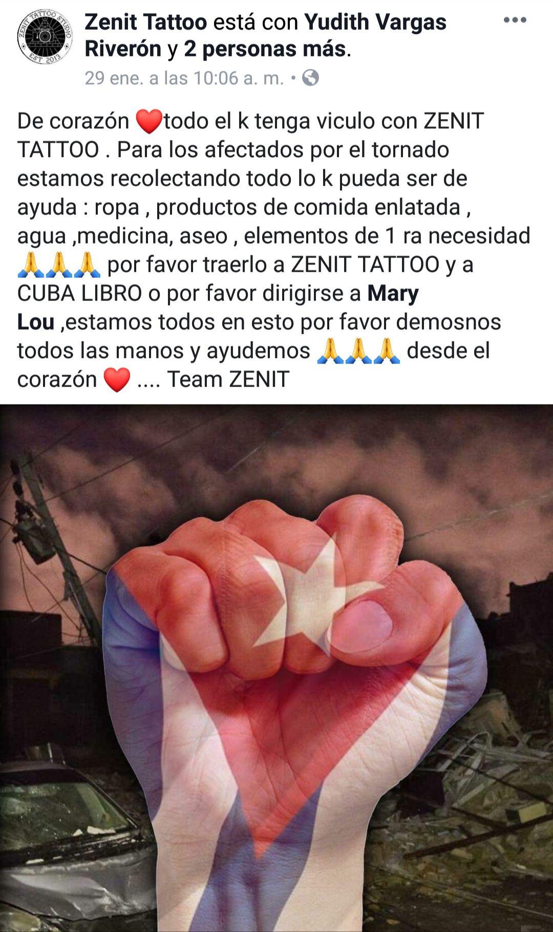 Zenitt Tatoo (calle 286 #114, Santa Fe) ha pedido a todas aquellas personas con un vínculo con ese estudio profesional de arte corporal, que se unan a la colecta que realizan de conjunto con Cuba Libro.