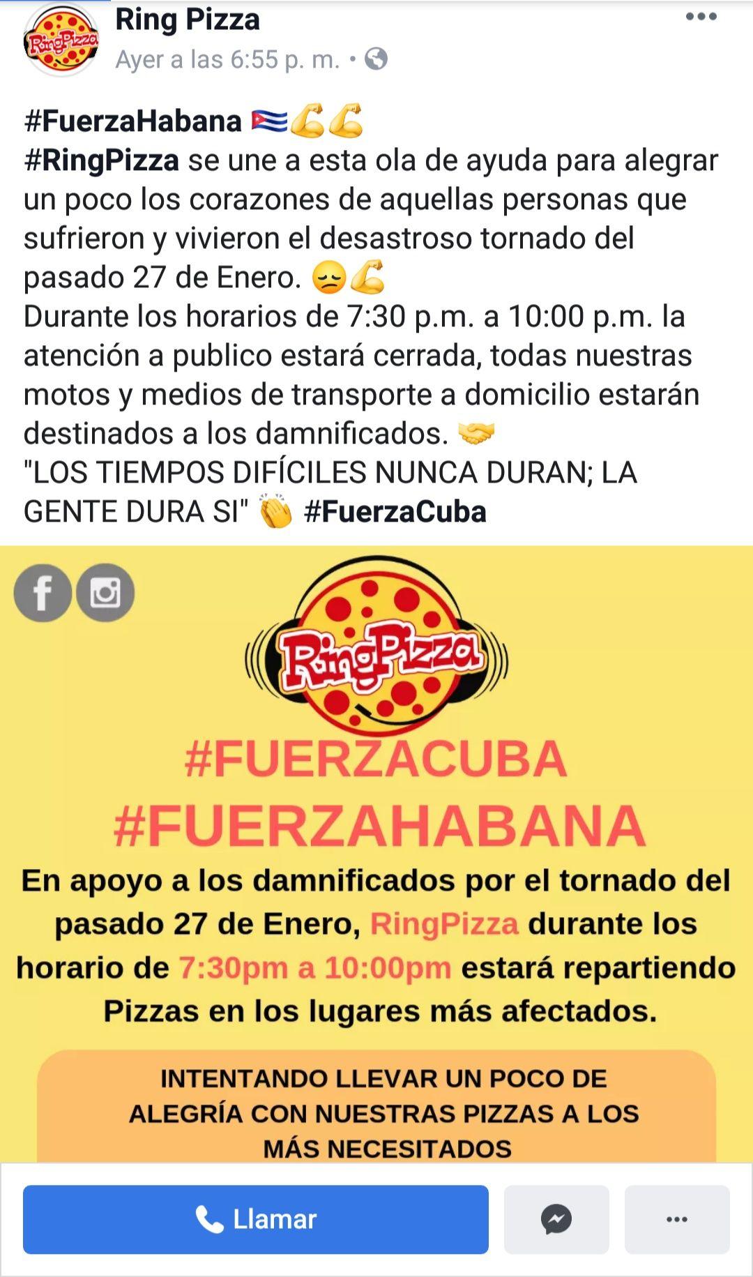 El negocio privado Ring Pizza cerró su atención al público a partir de las 7:30 pm y hasta las 10:00 pm y todas sus motos y medios de transporte están destinados a los damnificados. “Los tiempos difíciles nunca duran, la gente dura sí”, han compartido en Facebook.