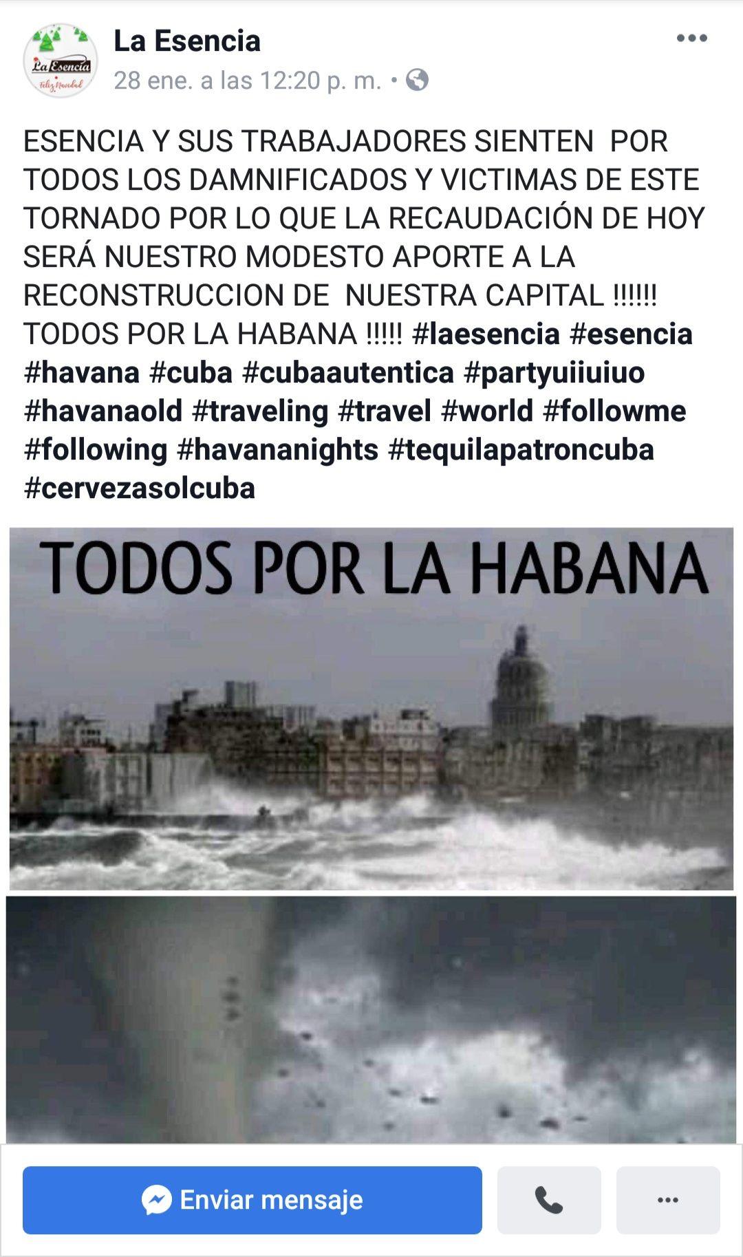 También en el Vedado, en el Bar La Esencia, popular dentro de la oferta recreativa nocturna de la capital, hicieron una primera colecta en la propia noche del 28 de enero. Allí está a la venta, uno de los cuadros del Premio Nacional de Artes Plásticas Manuel Vidal, cuyo pago también será donado. Descemer Bueno anunció que ofrecería un concierto, y toda la recaudación sería para ayudar a los más necesitados.