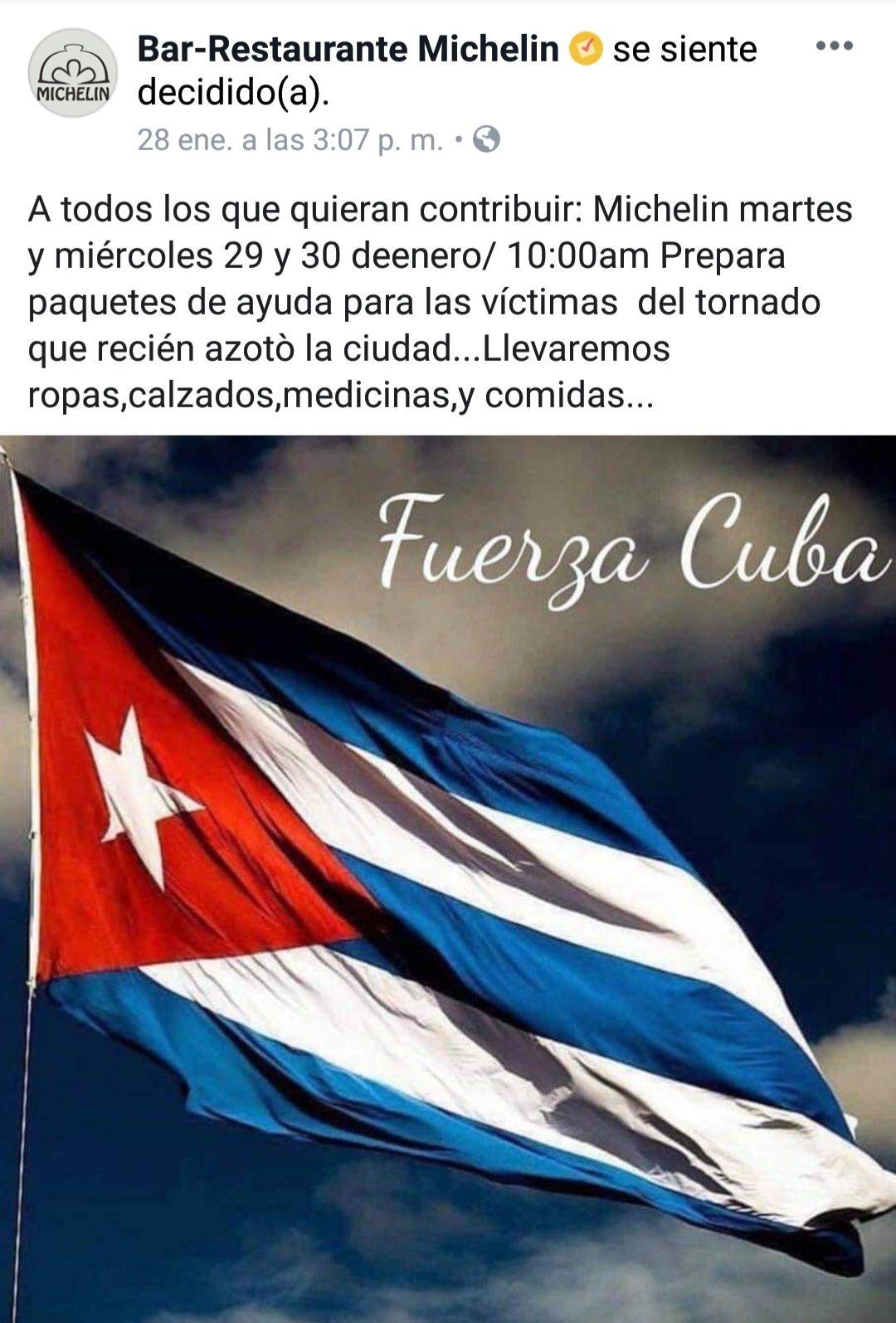 A través de la agencia de viajes Inmerse Cuba el Restaurante Michelin, ubicado en el Vedado, dio a conocer que recogen allí ropas, calzados, medicina, comida y todo aquello con lo que alguien quiera contribuir. Parte del equipo hará varias salidas al día para entregar los productos donados a los más necesitados.