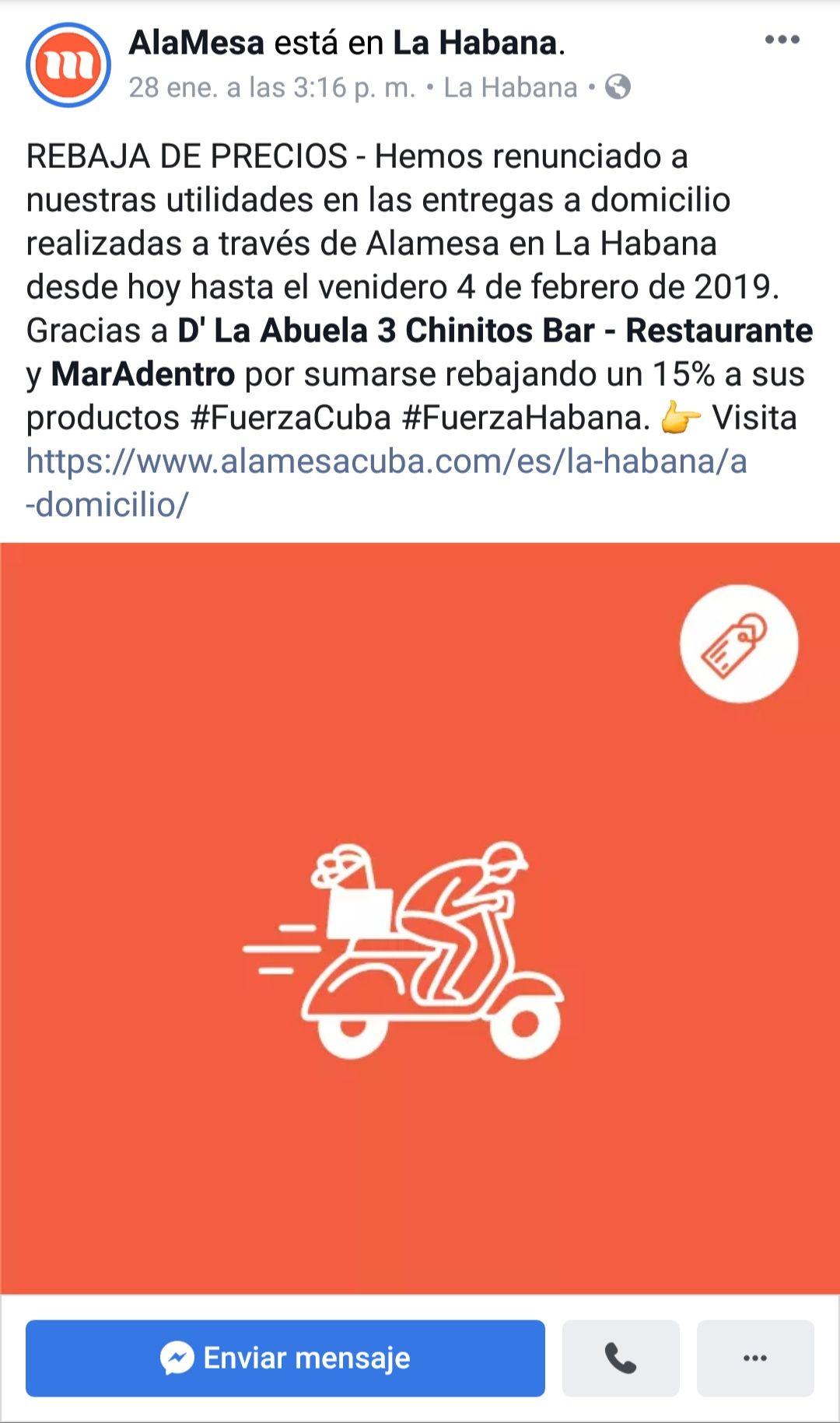 También hay forma de hacer pedidos desde el extranjero a través del sitio web del proyecto AlaMesa. Precisamente el directorio gastronómico también hizo una rebaja de precios en estos días y renunciaron a sus utilidades en las entregas a domicilio.