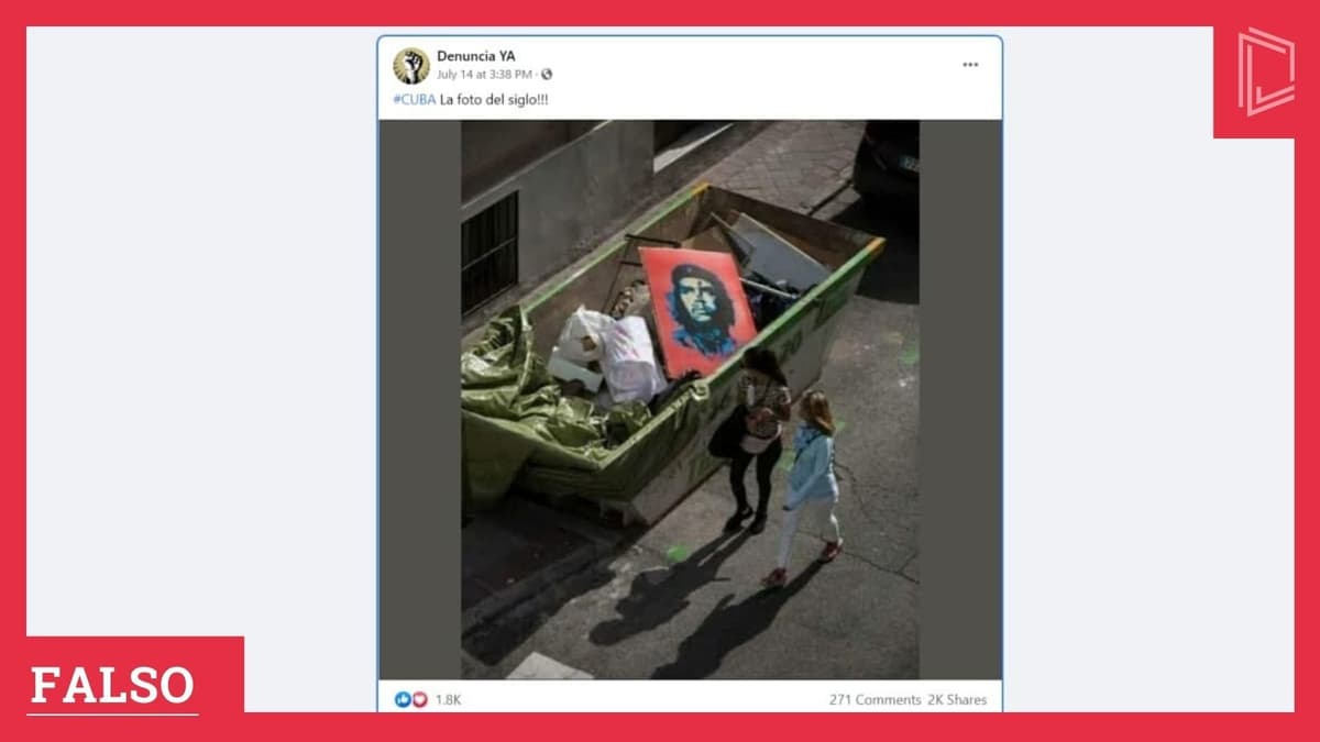 En Facebook circuló una foto en la cual se ve un cuadro de Ernesto Che Guevara tirado en un tanque de basura. Algunos se refieren a «la foto del siglo» y la ubican en Cuba durante las protestas. Solo en la cuenta Denuncia ya fue compartida 2 000 veces.