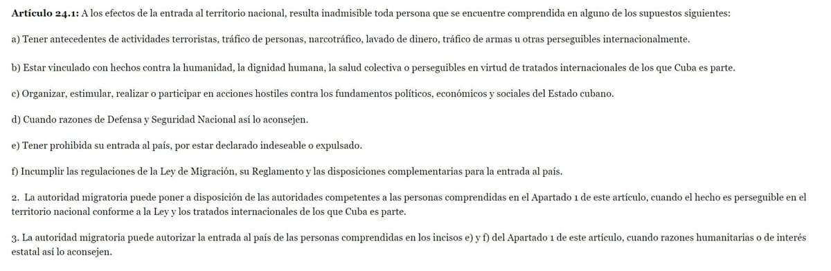 Aun cuando la Constitución cubana aprobada en 2019 reconoce el derecho a la libertad de movimiento, la Ley de Migración, en su artículo 24.1, regula motivos por los cuales las autoridades cubanas pueden impedir la entrada al territorio nacional de «cualquier persona», incluidos sus nacionales. Dentro de esos motivos destacan razones de seguridad nacional; participar en acciones hostiles contra los fundamentos políticos del Estado cubano; estar declarado como indeseable, etcétera, explica Viera.
