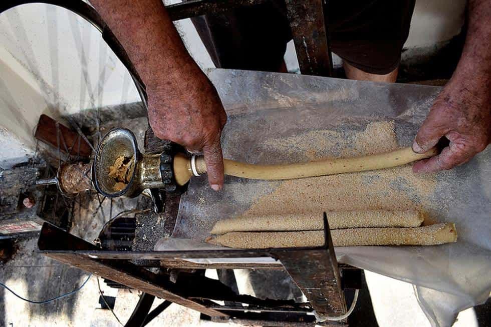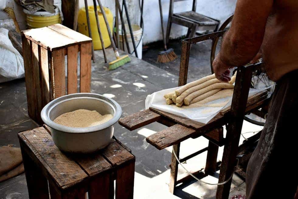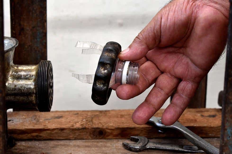 Primero fue la forma. Tomás adaptó la boca de un botellón plástico a la moledora de carne. “Descubrí el agua tibia, como se dice, porque eso estaba inventa´o, pero yo no lo copié. Hasta ahí nada del otro mundo, pasé la masa por la moledora dándole vuelta a la manigueta y salía parejita, como un cilindro, lista para trocear.”
