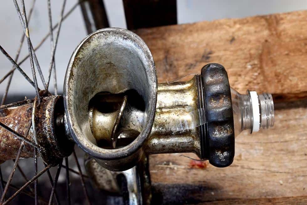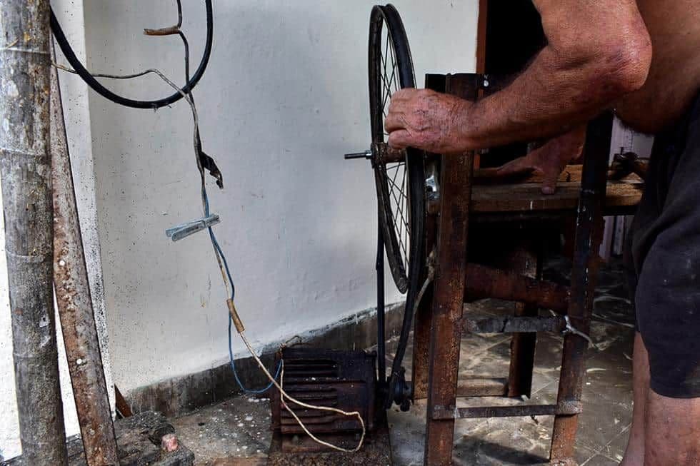 Las piezas son puro reciclaje. “La turbina da vida al milagro, una vez conectada a la corriente. El motor tira de una polea y gira la llanta de bicicleta que sustituye la manigueta de la moledora de carne. El movimiento rápido y repetido muele la masa de forma tal que en 11 segundos obtenemos 6 croquetas.”