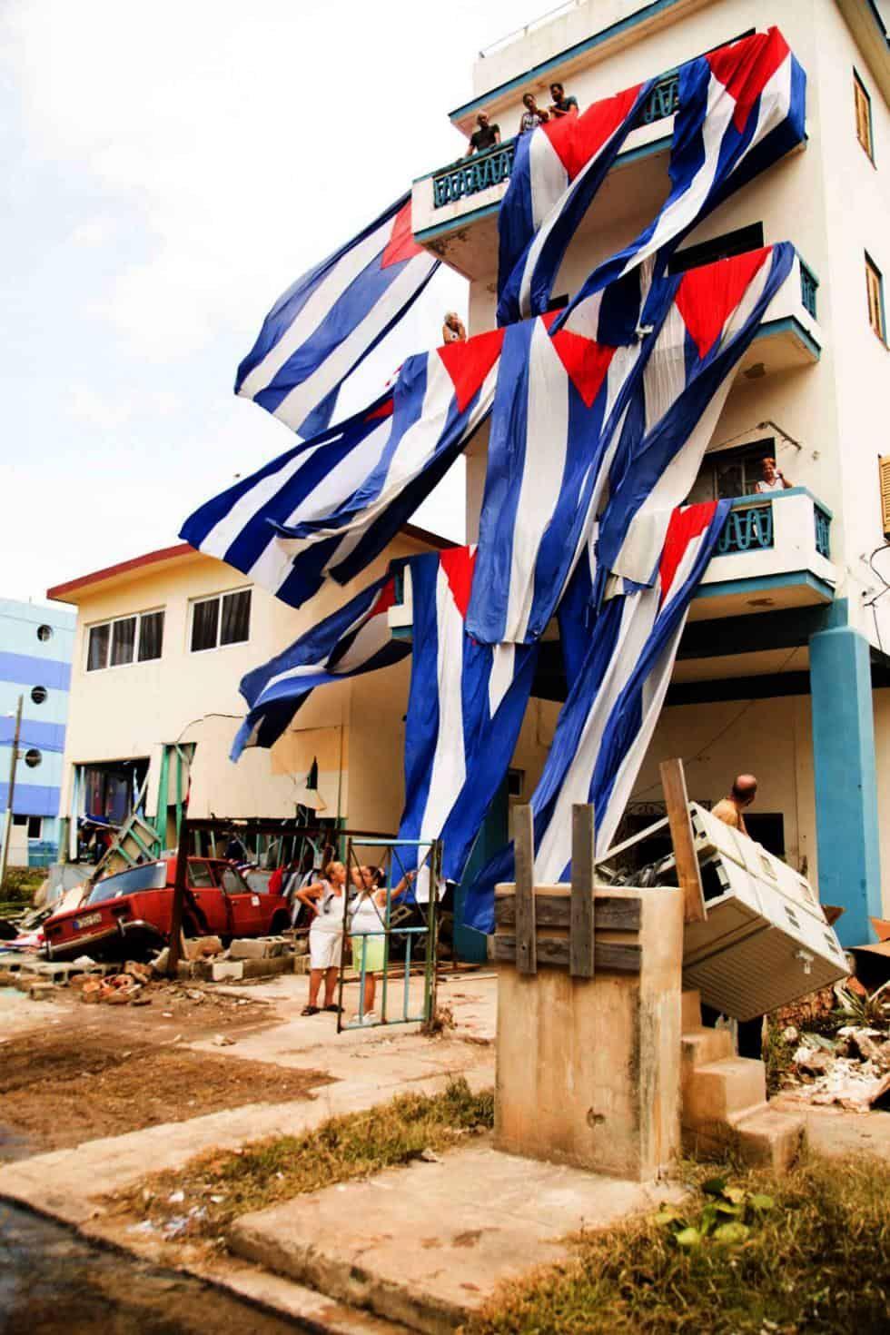 Este lunes en la mañana, cuando el país apenas se asomaba por la ventana para ver el destrozo causado por Irma, la calle 11 entre L y M amanecía tapizada con banderas cubanas de dos pisos de altura. De los balcones en aquella cuadra del Vedado colgaban, gigantescas, y contrastaban con el entorno del sitio, marcado por el desastre.
