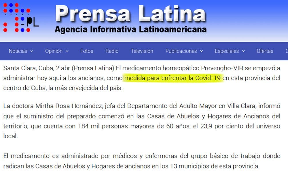 En Villa Clara, la segunda provincia con más casos confirmados en el país, se está aplicando en las Casas de Abuelos y Ancianos del territorio que incluyen a 184 000 ancianos en 13 municipios. Un reporte de Prensa Latina repite que el tratamiento “evita el nuevo coronavirus”. Ni el sitio de tratamientos clínicos en curso de China, ni la base de datos global de la Biblioteca Nacional de Medicina de Estados Unidos, ni el registro público cubano de ensayos clínicos recogen algún experimento realizado o en curso sobre las potencialidades del PrevengHo-Vir para prevenir la COVID-19.
