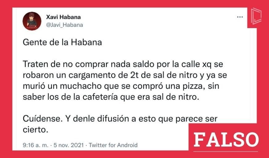 El 5 de noviembre el usuario @Javi_Habana publicó un tuit en el que pedía a sus seguidores no comprar sal en la calle e informaba de la muerte de un muchacho luego de comerse una pizza que contenía este compuesto.