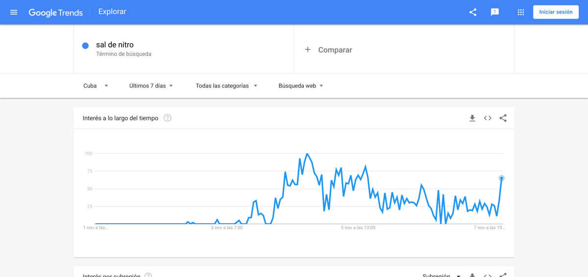 Las primeras publicaciones sobre el tema aparecieron el 3 de noviembre. En esa fecha, Google Trends registró un aumento puntual de las búsquedas realizadas en Cuba sobre el término «sal de nitro». Al día siguiente la información alcanzó popularidad, cuando Juan Juan Almeida publicó detalles del suceso en su canal de YouTube.