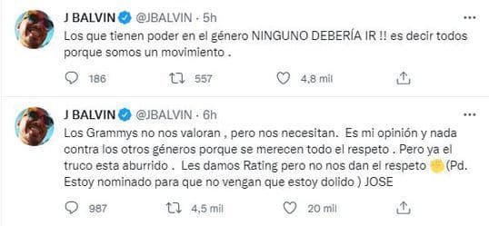 Todo comenzó el 28 de septiembre de 2021. Tras conocerse las nominaciones a los premios Latin Grammy en su edición 22, J Balvin —nominado en las categorías Canción del Año, Mejor Canción Urbana y Mejor Interpretación de Reguetón— publicó dos tuits (luego eliminados) en los que criticó los premios y llamó al boicot de la ceremonia.