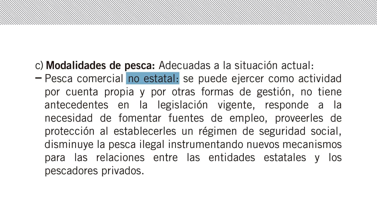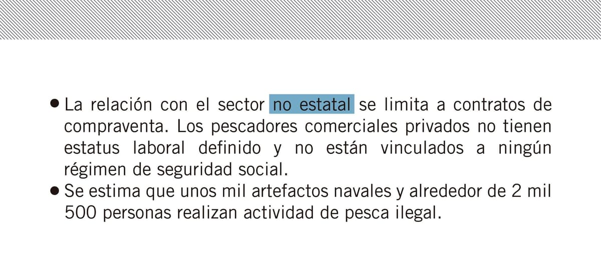 Sin embargo, la decisión no crea nuevos puestos de trabajo; ofrece vías para que las 2 mil 500 personas que se dedican actualmente a la pesca ilegal puedan legalizarse y para que los 18 mil 638 que realizan la “pesca comercial privada” —no reconocida como labor independiente en la legislación vigente, pero sí admitida por el Estado y cuyos exponentes mantienen relaciones contractuales casi obligatorias con empresas estatales— puedan recibir las garantías de la seguridad social derivadas del trabajo por cuenta propia.