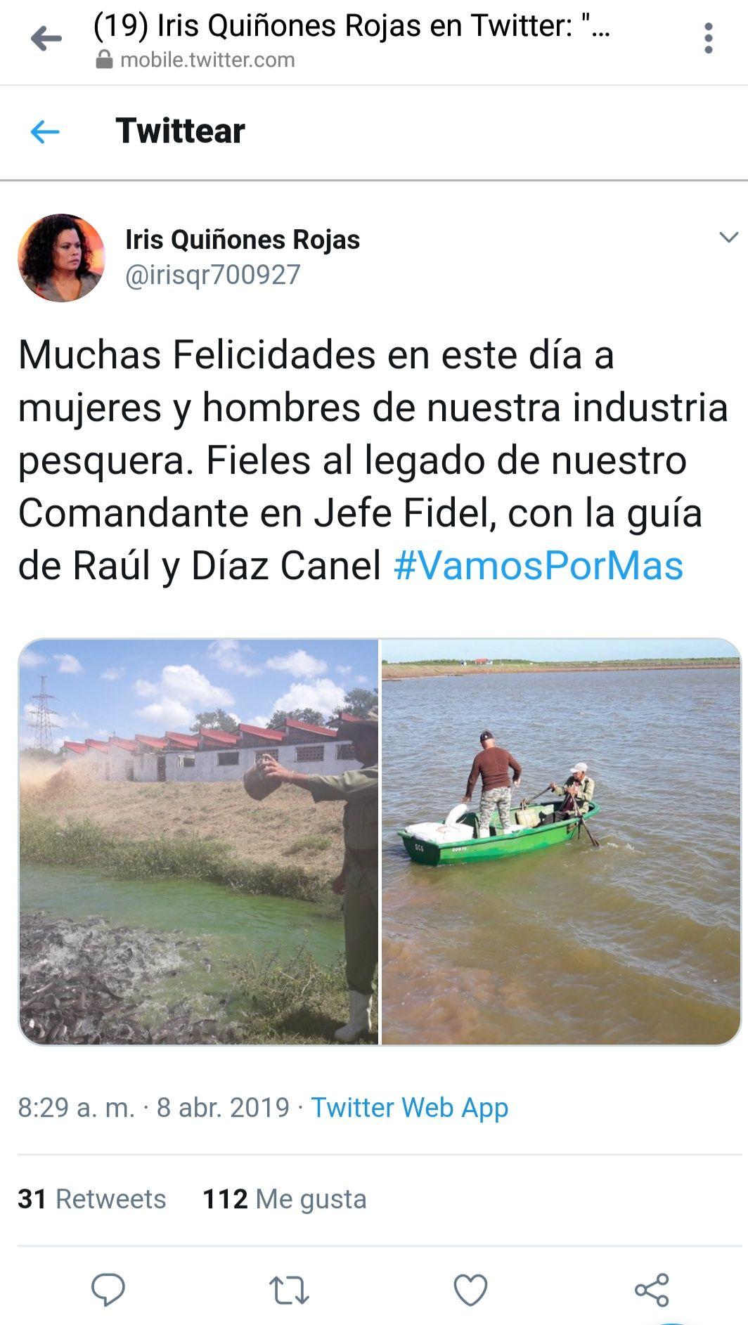 Tuit de la ministra de la Industria Alimenticia para felicitar a los pescadores. Tomado de su perfil en Twitter.