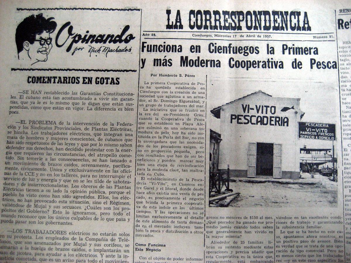 Recorte del periódico La Correspondencia sobre la creación en 1957 en Cienfuegos de una cooperativa de pesca para contribuir al desarrollo de este sector. Archivo privado del Ingeniero Eloy Manuel Viera Moreno.