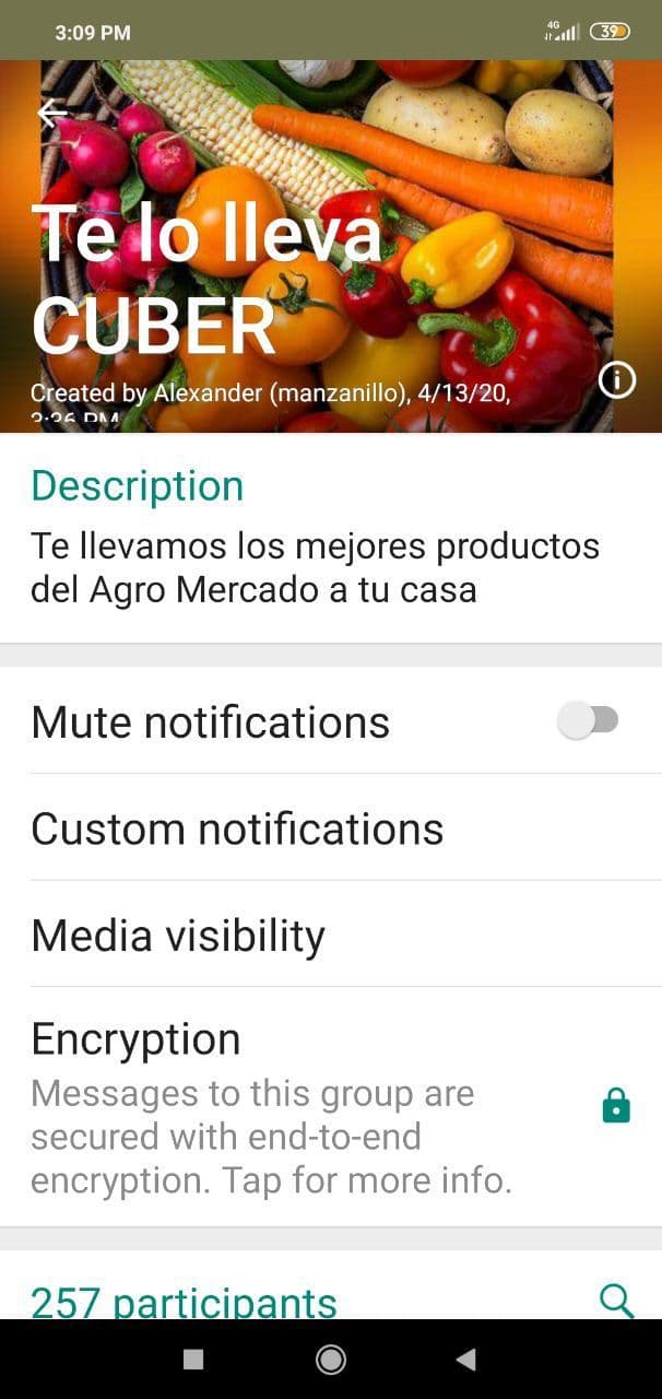 Grupo de WhatsApp creado por iniciativa de Cuber, un servicio de transporte a demanda que ante la COVID-19 permite adquirir desde el hogar productos frescos del agro. Según explican en sus materiales promocionales, respetan los precios y solo cobran por el envío.