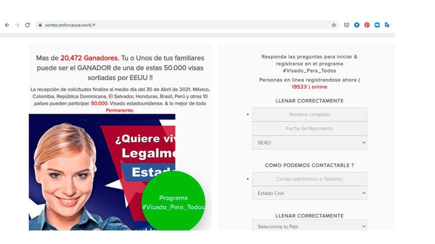 Está circulando a través de redes sociales el enlace a un sitio que promueve un supuesto sorteo, y ofrece a los ganadores la posibilidad de obtener un visado turístico o residencia permanente en los Estados Unidos. Tiene fecha de cierre el 30 de abril de 2021 y Cuba es uno de los países incluidos en la lista de los que pueden postularse.