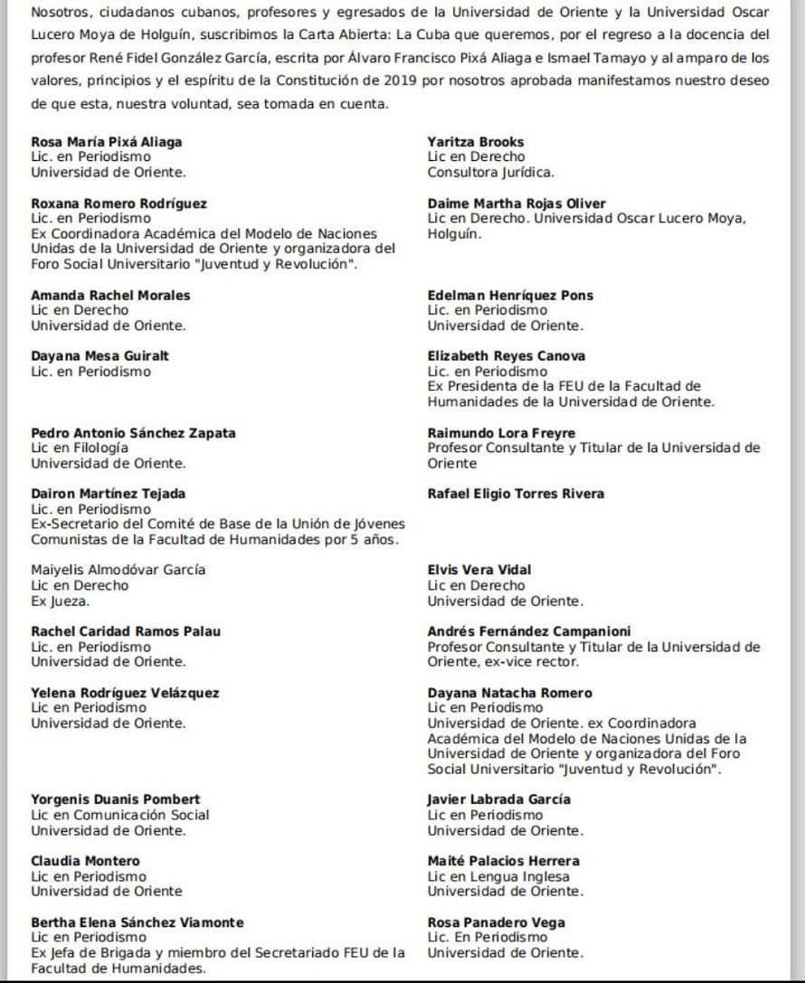 “Queremos que René Fidel vuelva a nuestra Universidad, a nuestra Facultad de Derecho, que formalmente se le devuelva su condición de profesor que no ha hecho más que honrar (…) Esto es para nosotros, lo único revolucionario y decente. Es la Cuba que queremos”, concluyen.