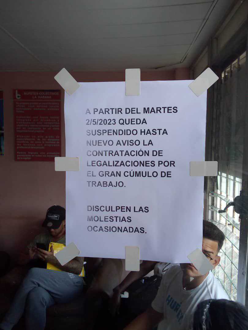 En un bufete de Santa Cruz del Norte, Mayabeque, explicaron que desde el 26 de abril de 2023 las nuevas contrataciones para realizar legalizaciones están detenidas hasta nuevo aviso y en espera de indicaciones de los «organismos superiores».