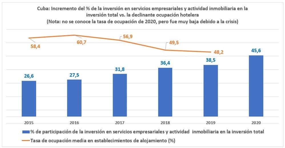 Lo incierto del futuro no ha hecho mella en los planes de desarrollo turístico del país. Lo confirman los datos de la Oficina Nacional de Estadísticas e Información (ONEI). De enero a diciembre de 2020 los servicios empresariales y la actividad inmobiliaria y de alquiler acapararon el 45.6 % del presupuesto destinado a inversiones por el Estado. Esos sectores —que agrupan las distintas facetas de la industria hotelera— recibieron el grueso del capital disponible para nuevas obras.