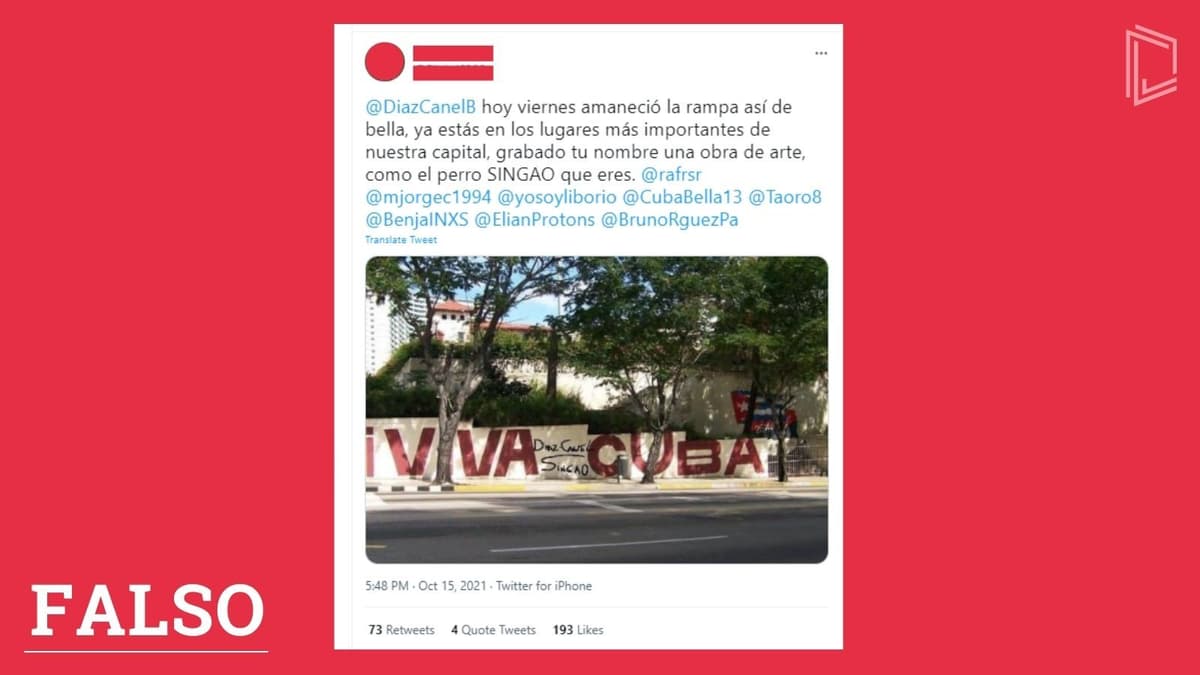 En Twitter apareció una foto de un cartel contra el presidente cubano Miguel Díaz-Canel, escrito en el muro de la sede provincial del partido comunista, en la calle 23, al lado del Pabellón Cuba. La publicación refería que se trataba de una foto del 15 de octubre de 2021. Y esto es FALSO.