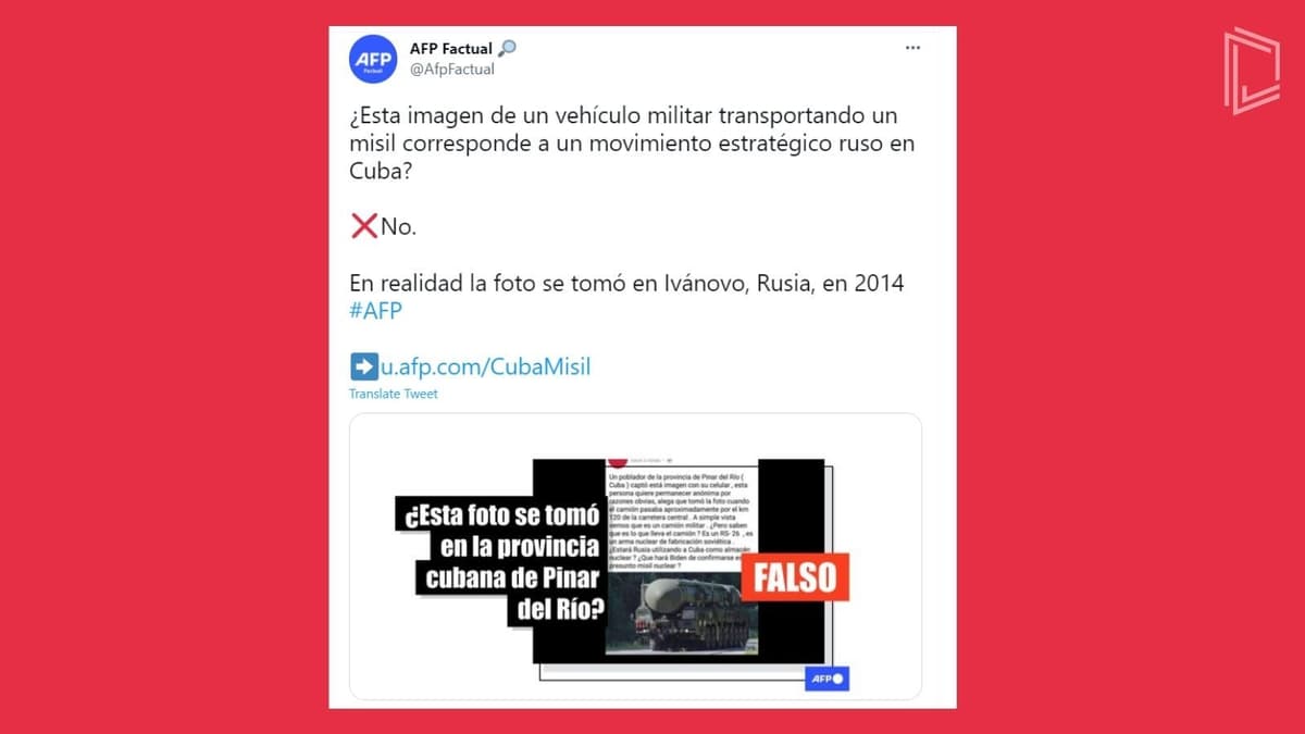 Diversas publicaciones en redes difundieron la imagen de un vehículo militar transportando un enorme misil. La fotografía fue compartida decenas de veces entre agosto y octubre de 2021, acompañada de un texto que advierte que el camión fue visto por un residente en la provincia Pinar del Río, Cuba.