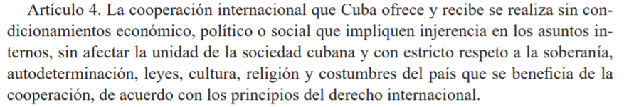 Uno de los principios legales básicos de la cooperación internacional que Cuba ofrece y recibe es que se realice «sin condicionamientos económicos, políticos o sociales que impliquen injerencia en los asuntos internos».