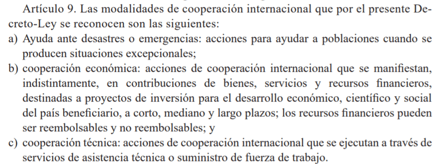 El Artículo 9 del Decreto Ley 16 también reconoce como una de las modalidades de cooperación internacional la «Ayuda ante desastres o emergencias»; esta consiste en «acciones para ayudar a poblaciones cuando se producen situaciones excepcionales».