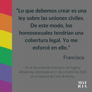 Ahora dice “son hijos de Dios y tienen derecho a una familia”, en el documental Francesco, del director Evgéni Afineevski, recién estrenado en el festival de cine de Roma.