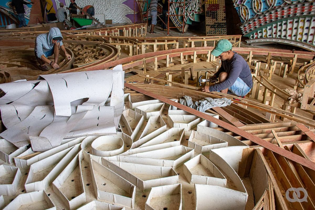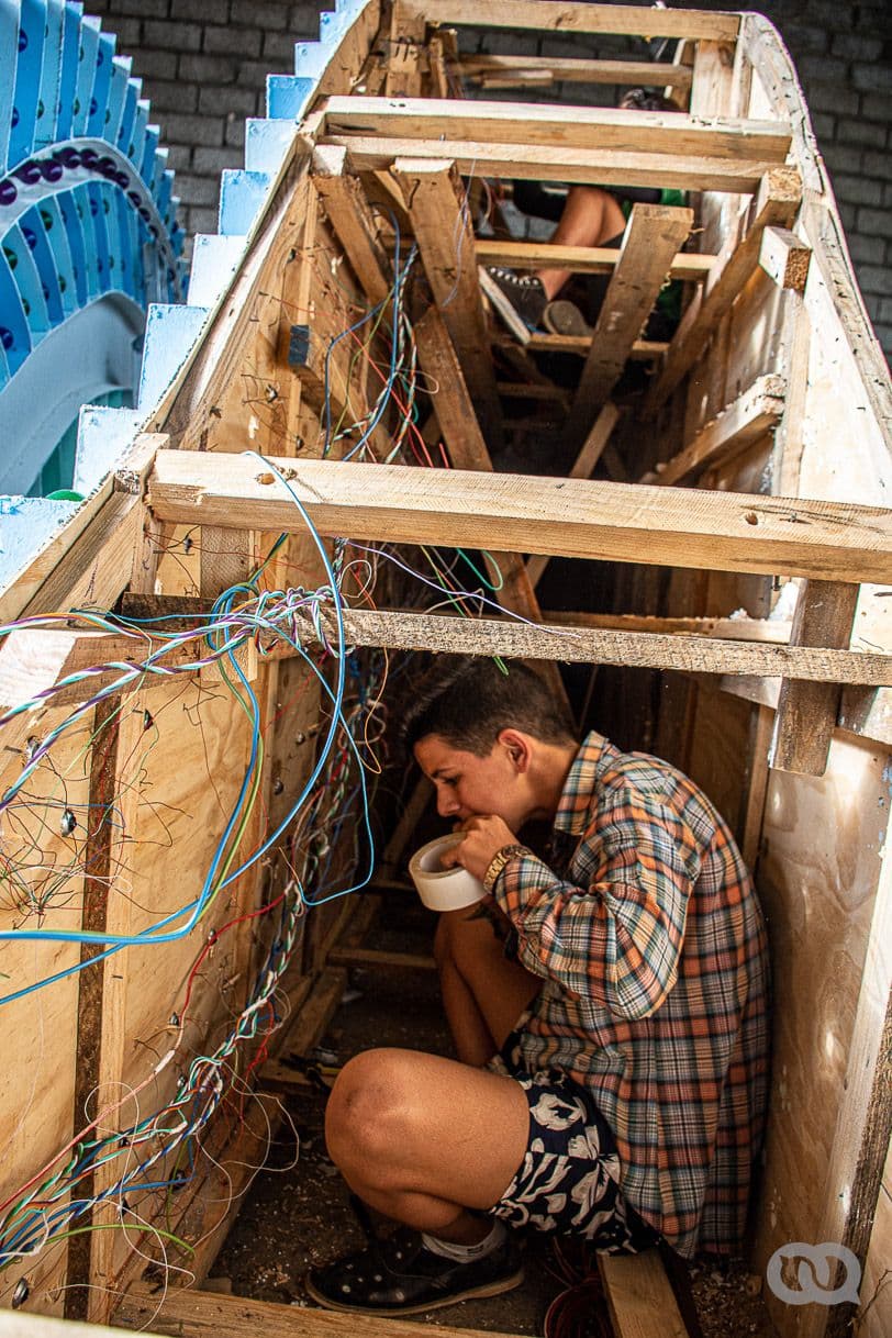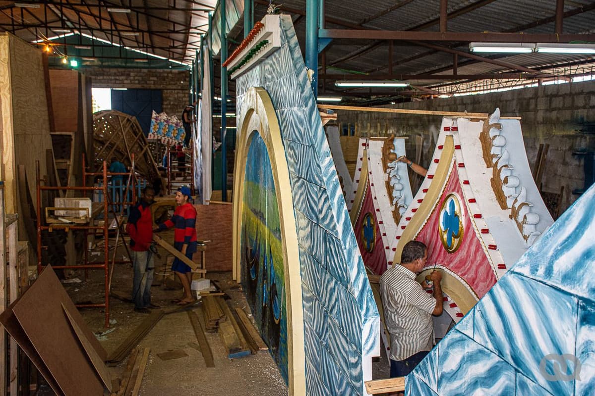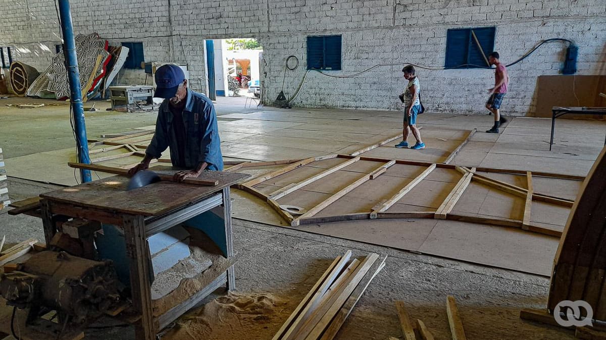 En 2017 apenas se podía caminar por los almacenes del barrio El Carmen, entre las partes del trabajo de plaza y la carroza en construcción, con más de 100 personas trabajando en distintas áreas artísticas y técnicas. Foto: Sadiel Mederos.
