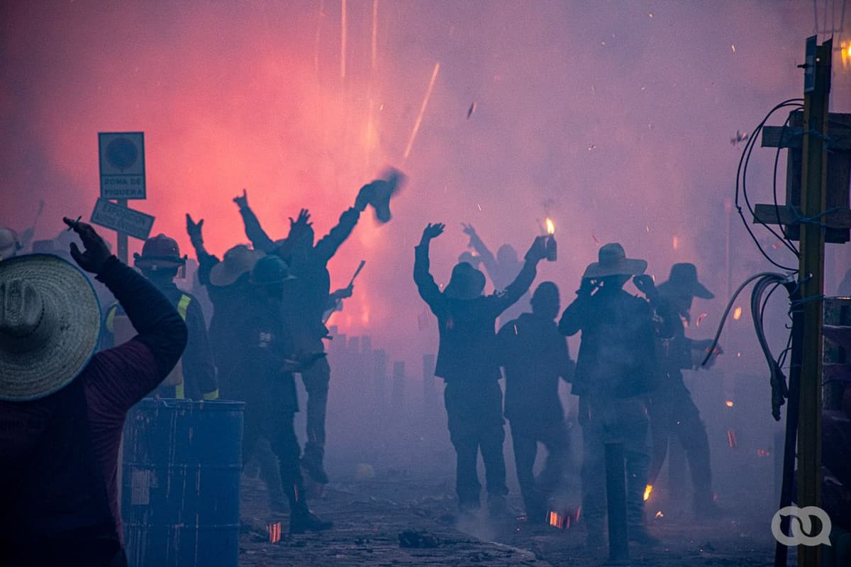 Mientras cientos de fuegos artificiales salen disparados en todas las direcciones con un ruido ensordecedor, los remedios bailan bajo las chispas y las nubes de azufre. Foto: Sadiel Mederos.