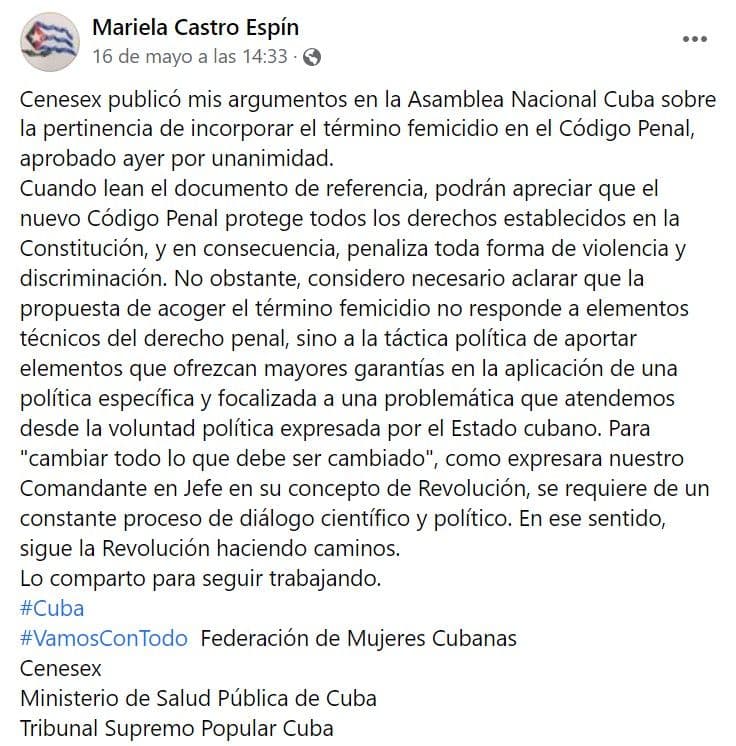 En 2015, el discurso de Mariela difería de sus actuales palabras ante la Asamblea. En ese entonces, afirmó para el medio Tiempo Argentino que en Cuba no se asesinaban mujeres por razones de género. «Nosotros no tenemos, por ejemplo, femicidios. Porque Cuba no es un país violento»; aclaró Castro Espín, además, que eso era un «mérito de la Revolución».