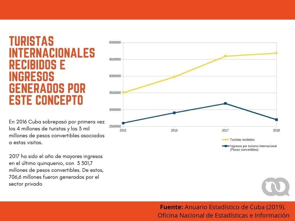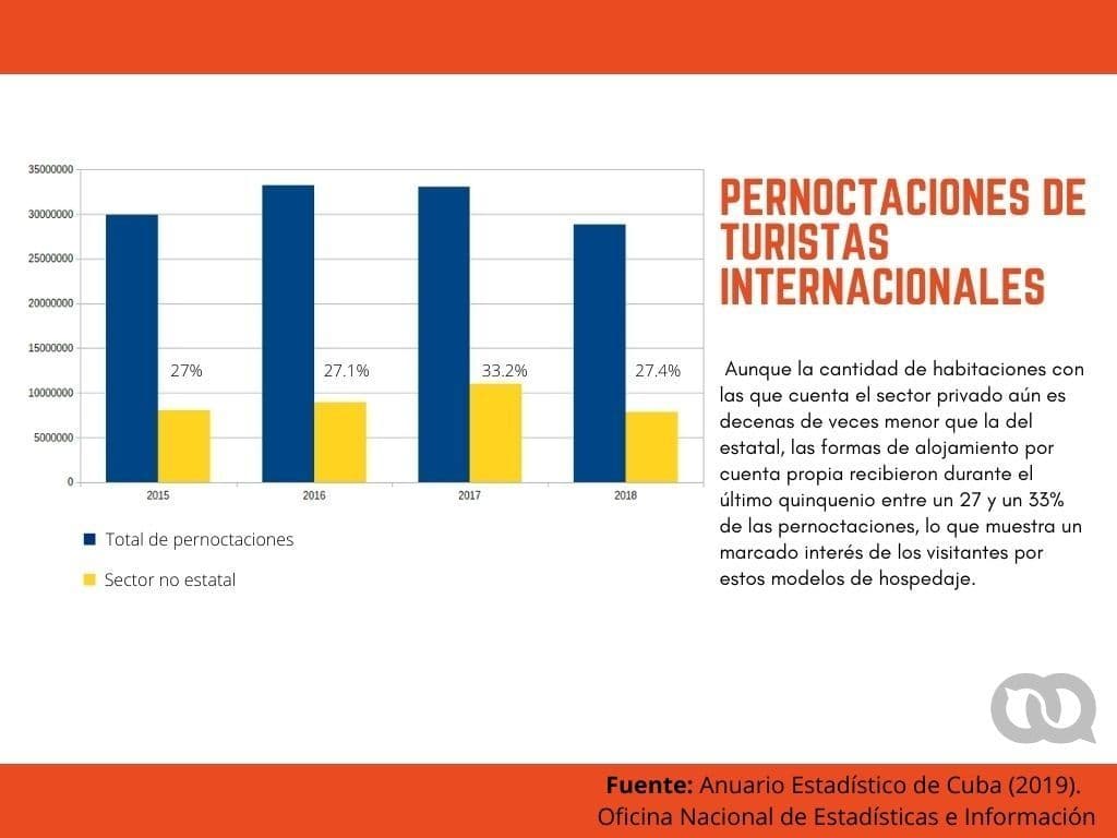 Al cierre de 2016 existían en Cuba unos 16 840 hospedajes privados, y se pronosticaba un crecimiento en cientos de ellos para 2017, año del mayor pico de ingresos por concepto de turismo en Cuba en el último quinquenio. Según datos de la Oficina Nacional de Estadísticas e Información (ONEI), durante 2017 el sector no estatal aportó al país casi la cuarta parte de los ingresos asociados al turismo internacional, y el sistema de hospedaje privado recibió 10 972 649 pernoctaciones, cerca de un tercio del total, lo que se traduce en un marcado interés de los visitantes por los alojamientos particulares.