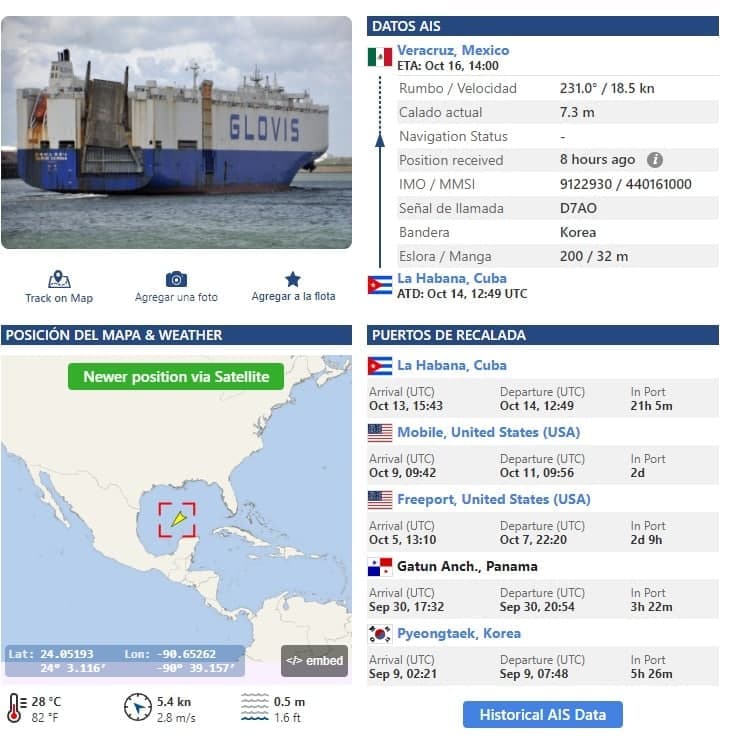 Conocemos que los automóviles fueron transportados hacia Cuba por el carguero GLOVIS CORONA, que navega bajo bandera surcoreana.