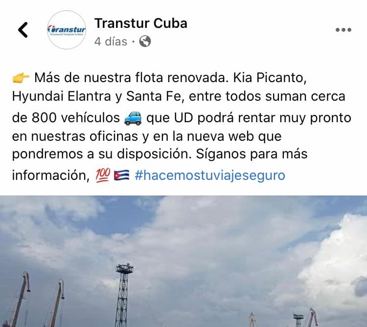 El 13 de octubre de 2021, la empresa cubana de transporte para el turismo Transtur informó en su perfil oficial en Facebook el arribo a puerto habanero de «cerca de 800 vehículos nuevos» de los modelos Kia Picanto, Hyundai Elantra y Santa Fe, para ser destinados a los servicios de renta.