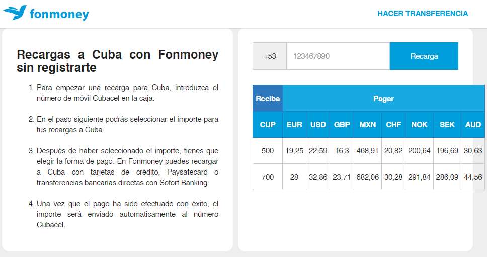 La Empresa de Telecomunicaciones de Cuba, Etecsa, en su web, recomienda algunos sitios oficiales online con los que la empresa cubana tiene convenios para el envío de recargas desde el exterior.