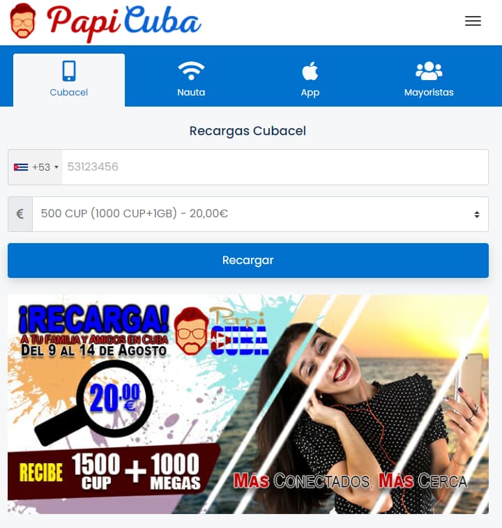 PapiCuba es una agencia online de recargas telefónicas que se especializa en el mercado cubano. Ofrece uno de los mejores paquetes de precios y es una plataforma segura y rápida.