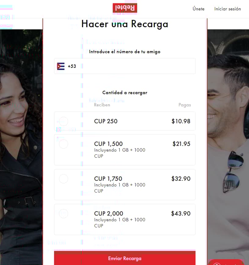 Para el envío de una recarga, se requiere que el cliente esté registrado, ya sea en el sitio web o en la aplicación, algo frecuente en sitios de este tipo.