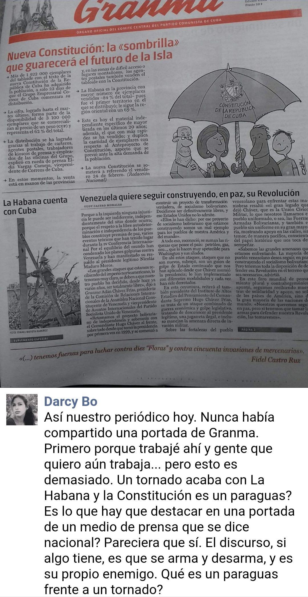 ¿Qué es un paraguas frente a un tornado?, se preguntaba una joven cubana en Facebook ante una portada del diario oficial Granma, donde se hablaba de la nueva constitución como la “sombrilla” que guarecerá el futuro de la Isla.