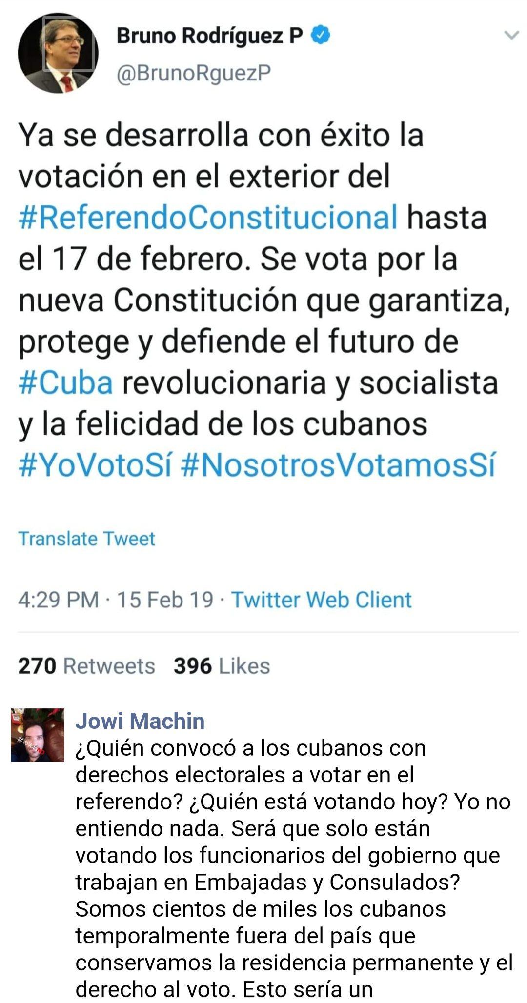 Reacciones de cubanos residentes en el extranjero que reclaman su derecho al voto. Captura de pantalla del perfil en Twitter del Ministro de Relaciones Exteriores Bruno Rodríguez Parrilla.