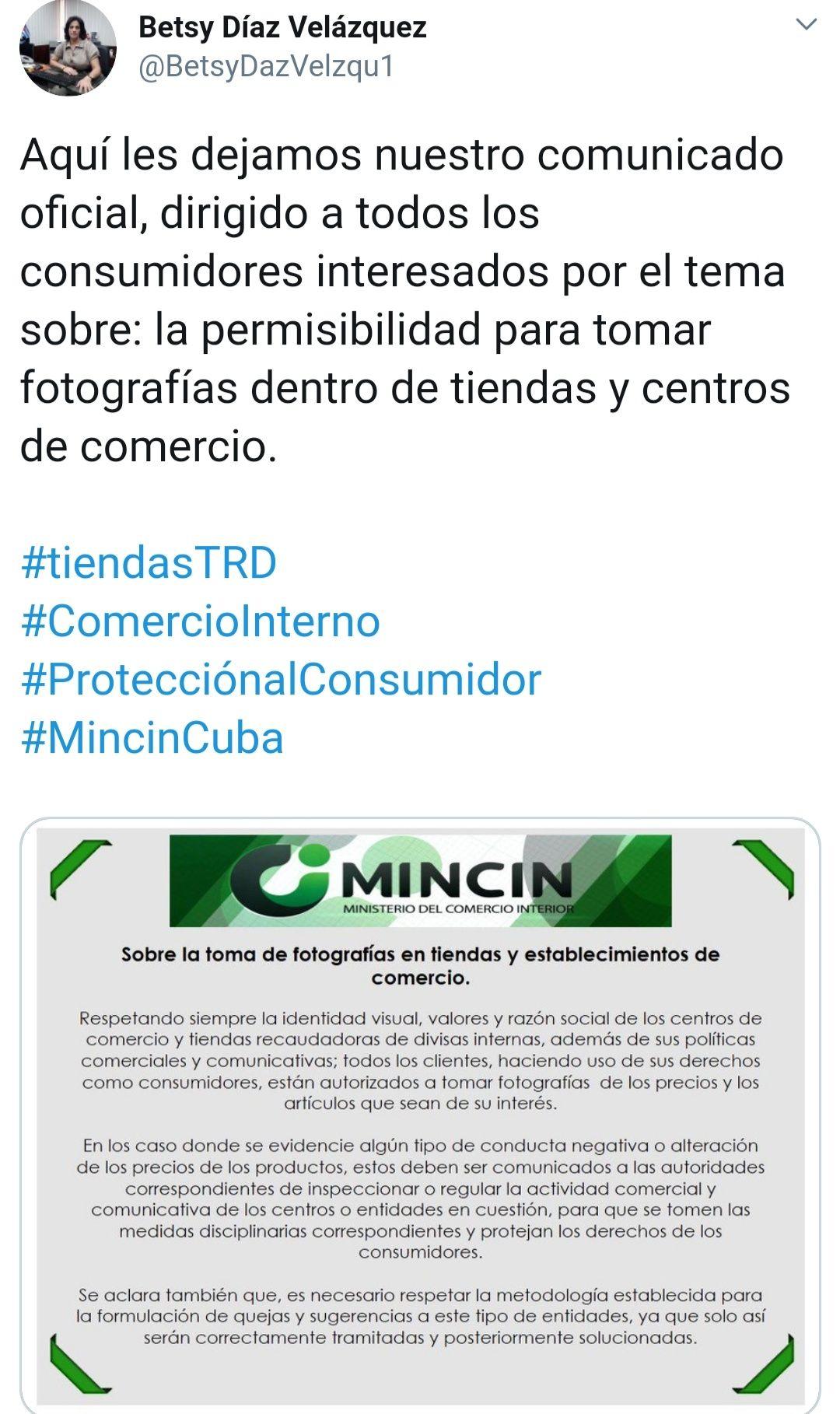 El documento, aplicable a formas de gestión estatal y no estatal, formalizó en norma jurídica una indicación que meses atrás la titular de ese ramo, Betsy Díaz Velázquez, había publicado en un tuit: “Los consumidores pueden tomar fotografías a los bienes que se comercializan, así como a los precios que sean de su interés”.