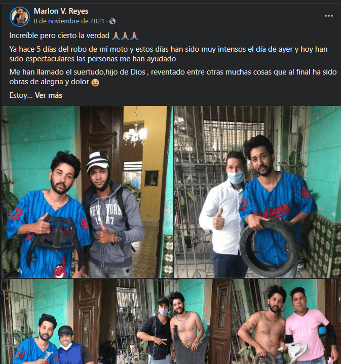 Si bien el reclamo en las redes sociales no le trajo ventajas a Manuel, en otros casos la relación entre los motoristas ha sido imprescindible. A Marlon Reyes también le robaron su moto en la puerta de su casa en el municipio Diez de Octubre a la una de la tarde del 2 de noviembre de 2021. Su vehículo no ha aparecido, pero en el grupo Amantes a las motos eléctricas nació una iniciativa con el fin de ayudarlo.
