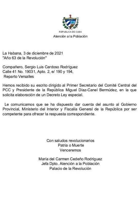 Foto tomada de la publicación en Facebook de Sergio Luis Cardoso, en la cual el Consejo de Ministros notifica la recepción de la carta.